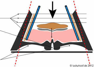 | Hier die gesteigerte Variante: In die mittlere Strahlfurche hat sich ein Bakterienstamm eingenistet, also Strahlfäule. Die Sohle ist noch dünner, entweder auch durch Fäule, oder durch Wegschneiden. Dadurch wird das Durchsacken der Hufunterfläche gefördert. (Orientierungslinien) |